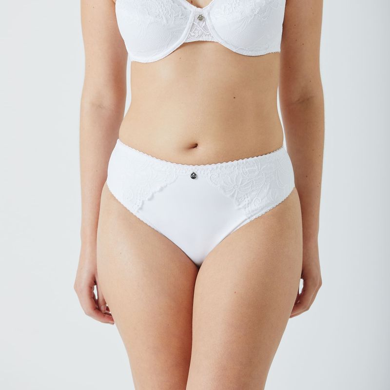 El diseño cavado estiliza la silueta, mientras que la puntilla suave en los laterales suma un toque delicado y femenino.